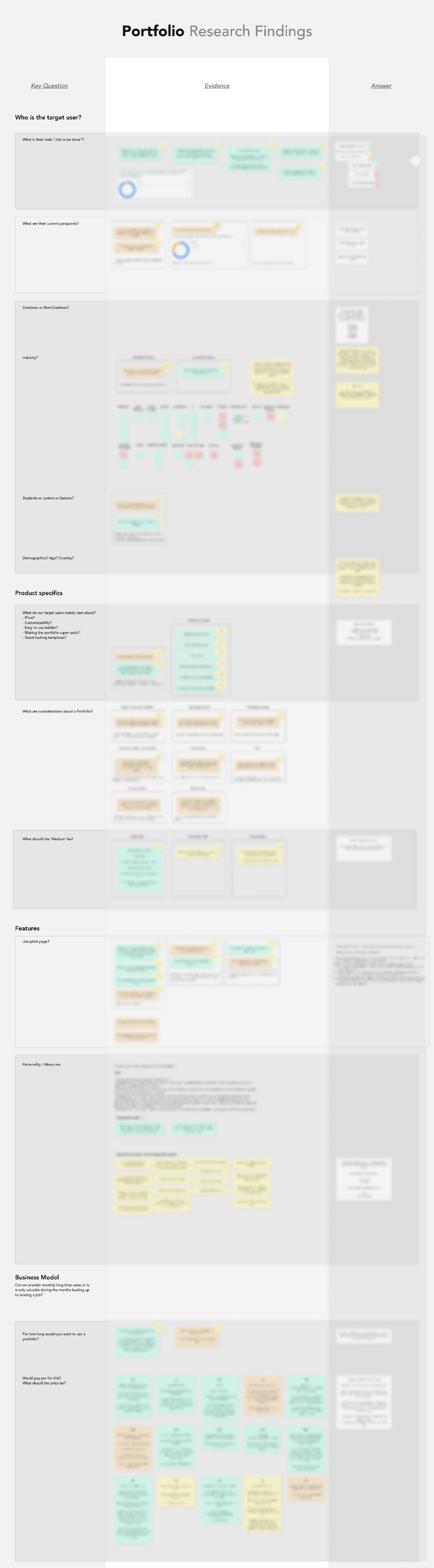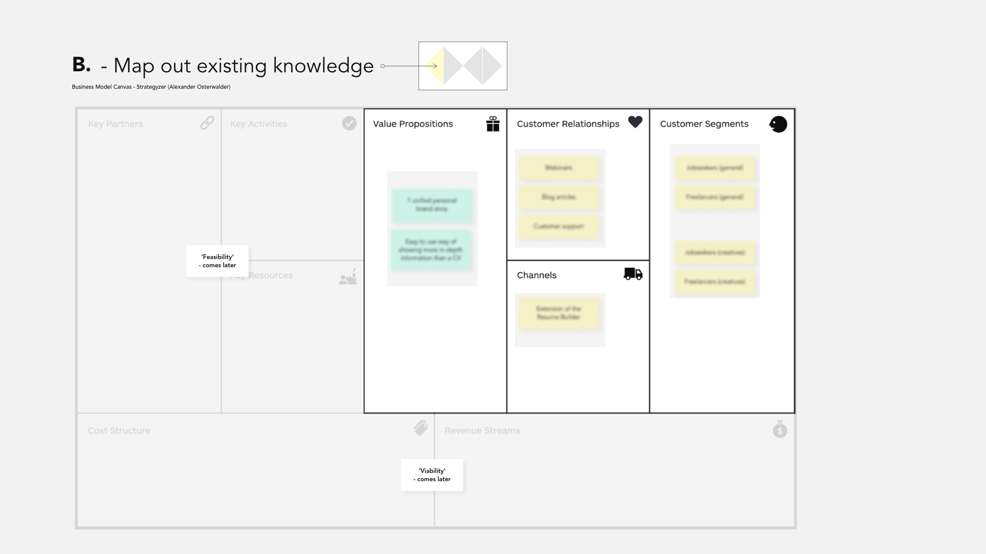 After defining the design brief, it was time to map out existing knowledge we already had in the context of portfolios and job-seeking. To map this out systematically, I used the Value Proposition and Business Model Canvas. As this was done before doing any research, these maps were filled in using the knowledge we have from our customers and our own experiences building a portfolio, so mainly assumptions that would need to be validated.