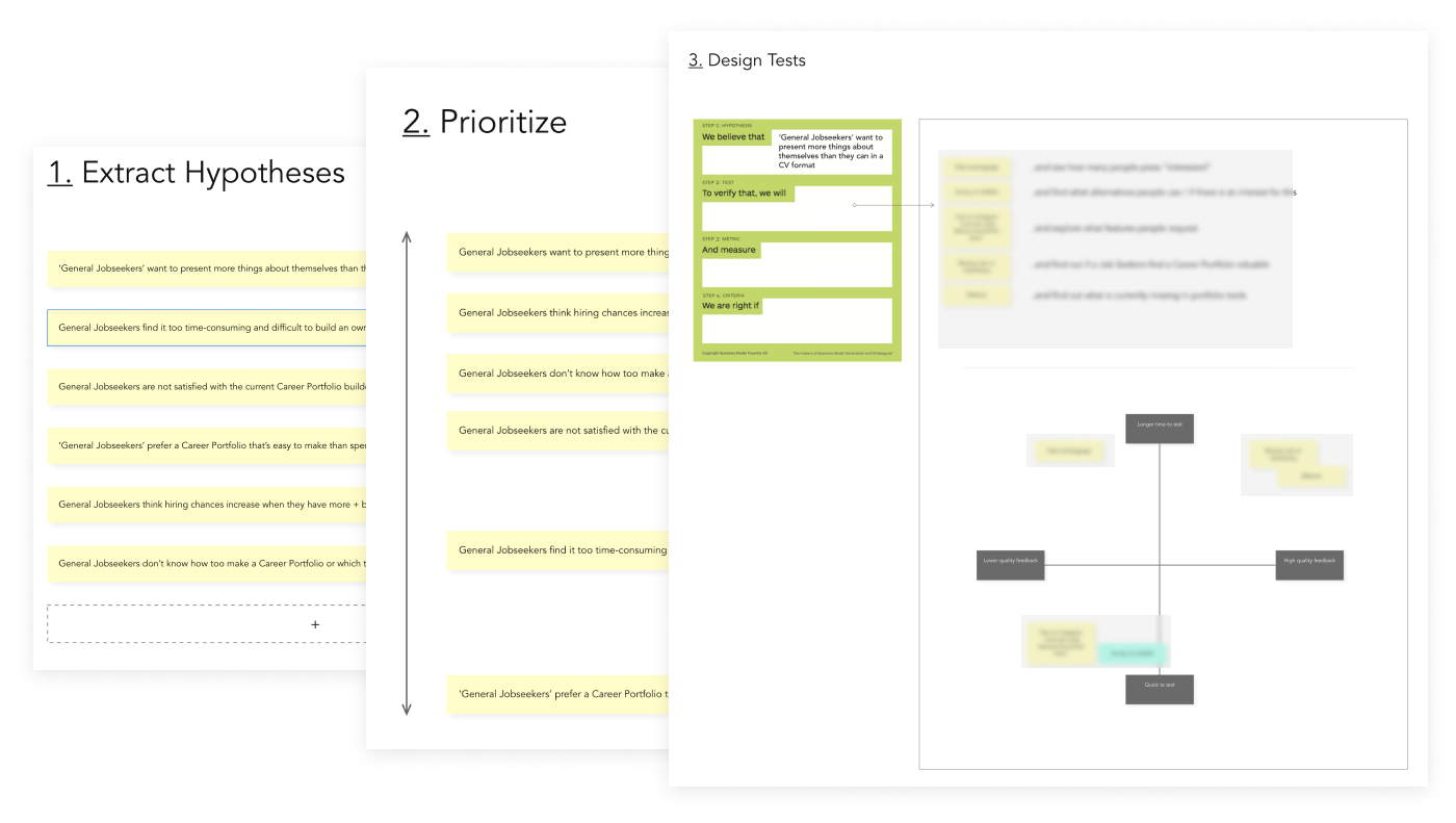 After we explored the context, it was time to start testing our assumptions. Before diving in, it was essential to define the testing process as testing and analyzing outcomes can quickly become chaotic. ‘Hypothesis cards’ and dedicated tests to validate or invalidate our assumptions were used to plan the following testing steps.