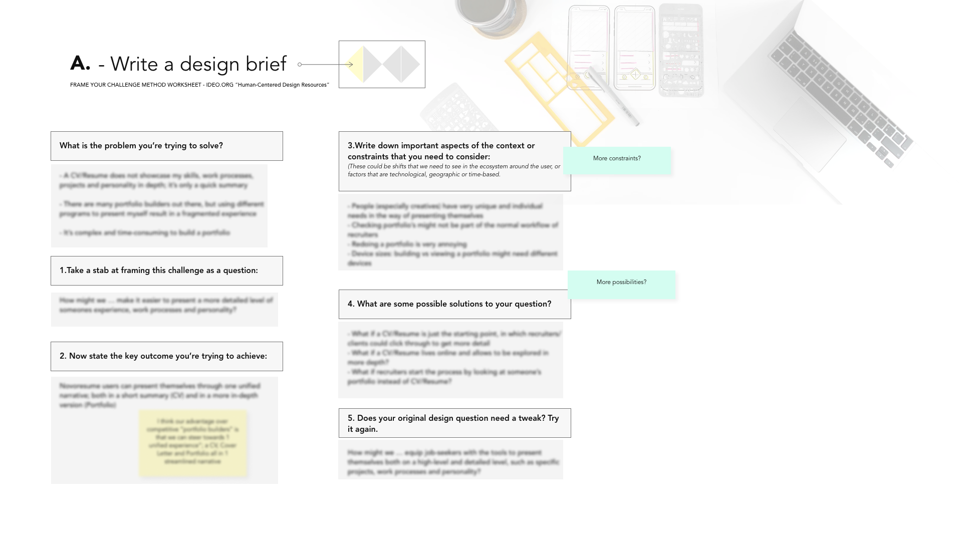 The first step of this project was to write a clear design brief to understand and frame the problem clearly. There are several ways to construct a design brief; for this project I used IDEO’s approach and answered a few of their key questions to explore the context of the project: