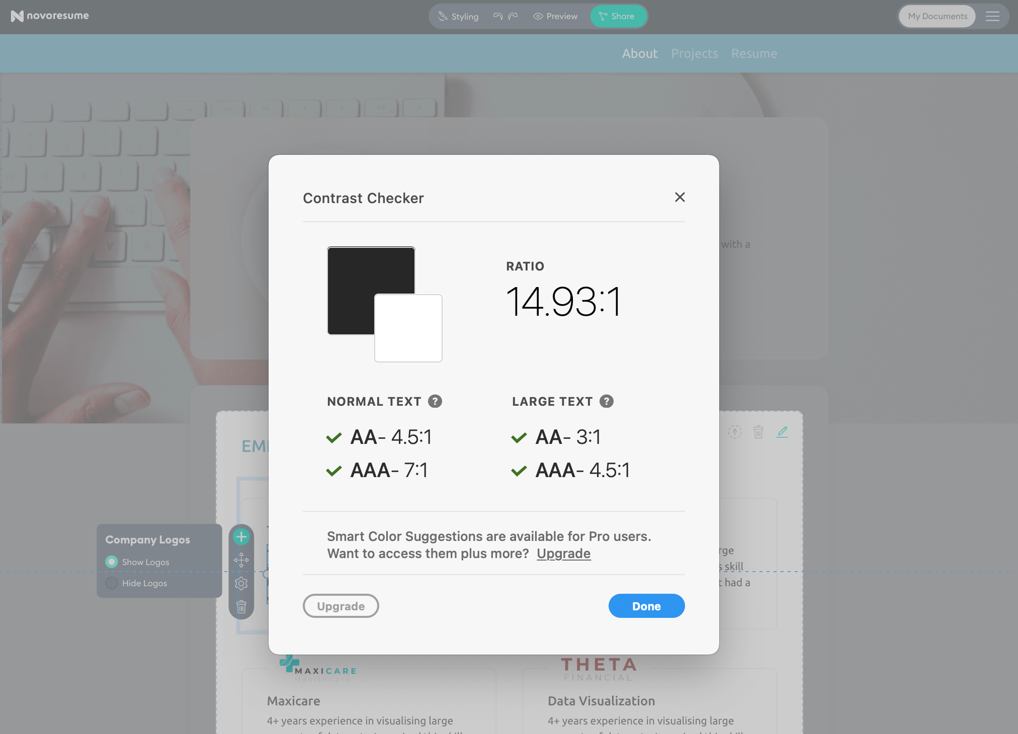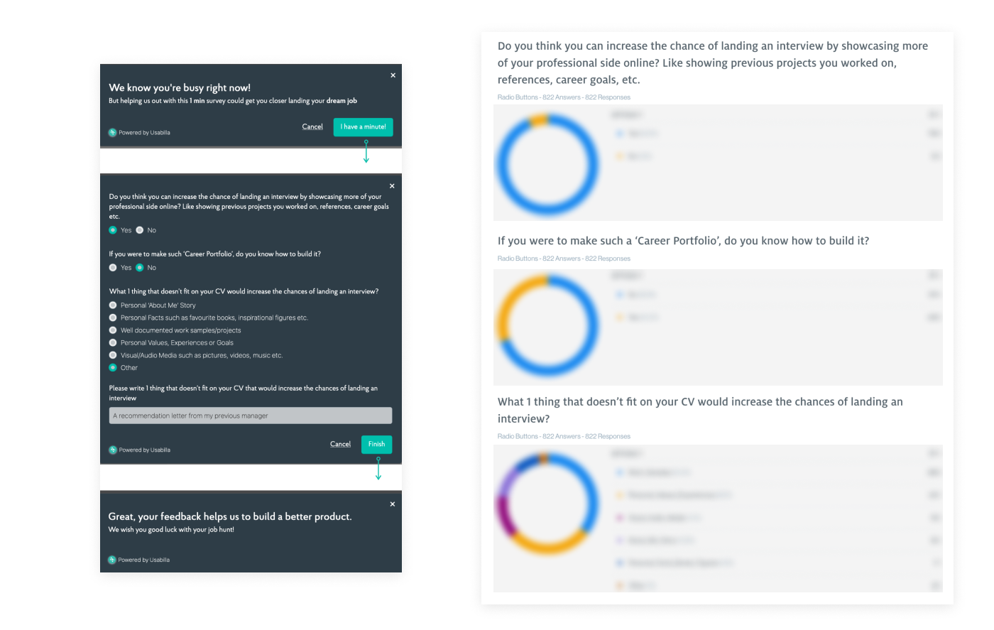 The first test was a quantitative survey among our users to determine if there is a general interest in a portfolio builder and what people would like to share with a potential recruiter/ employer that doesn’t fit or belong on a resume. 822 respondents filled in the survey, and the overall outcome was that the majority would benefit in their job search if they would have a portfolio showcasing their work and profile. We also learned what elements don’t fit on a resume, but job-seekers want to show this to recruiters. As it’s only a first test, we shouldn’t get ahead of ourselves, so more tests would be required to validate our hypotheses.