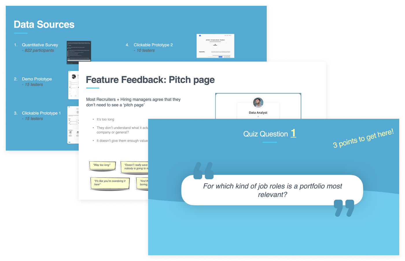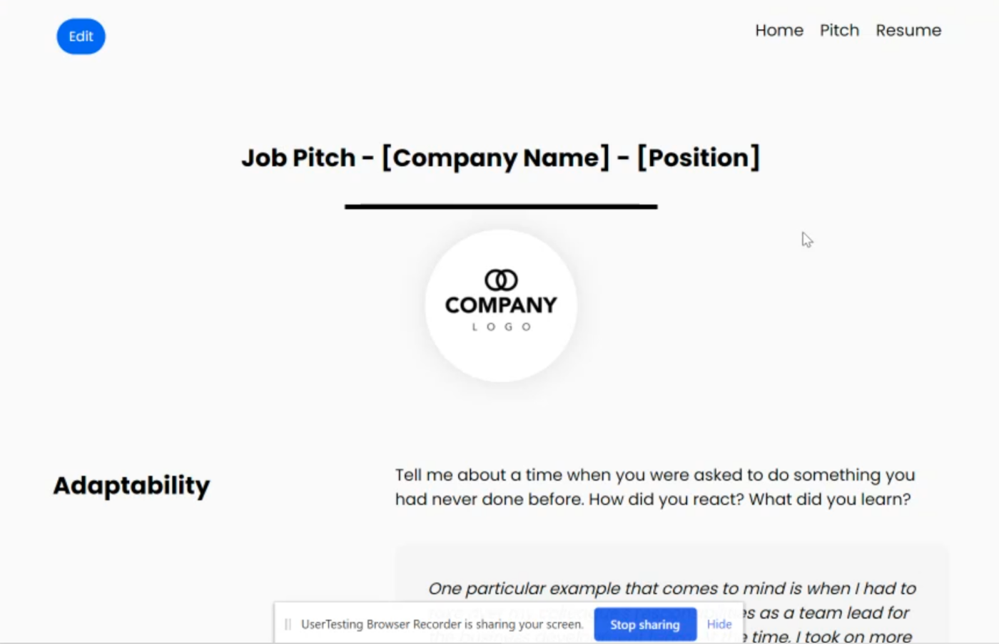 The fourth test was another low-fidelity clickable prototype focusing on a specific feature; a pitch page, where job-seekers could answer specific questions and pitch themselves to recruiters. 10 job-seekers tested this prototype through ‘Usertesting,’ and the reactions to this feature were not as enthusiastic as the previous ones. This is precisely why we test low-fidelity features early on, thereby saving time and development efforts later.