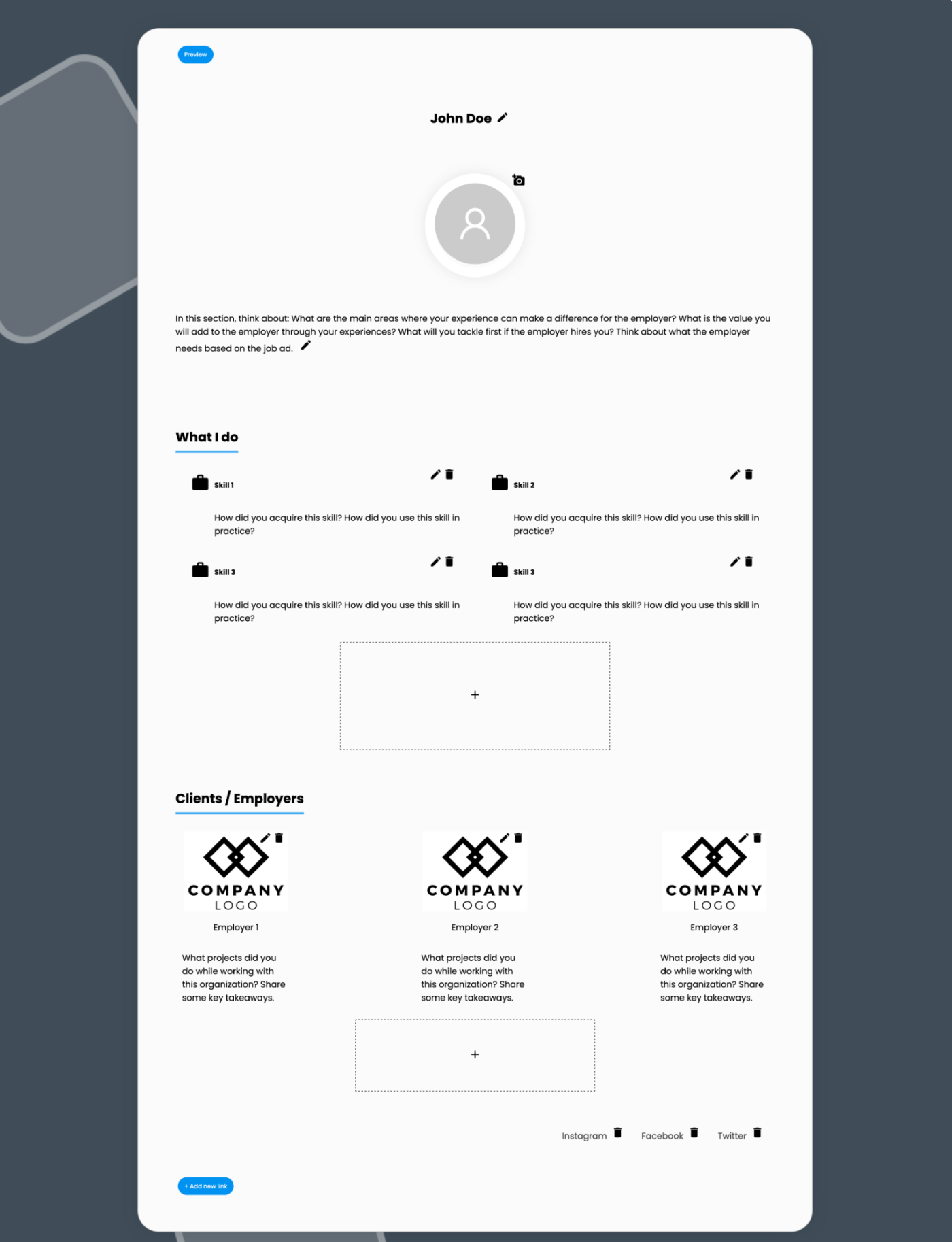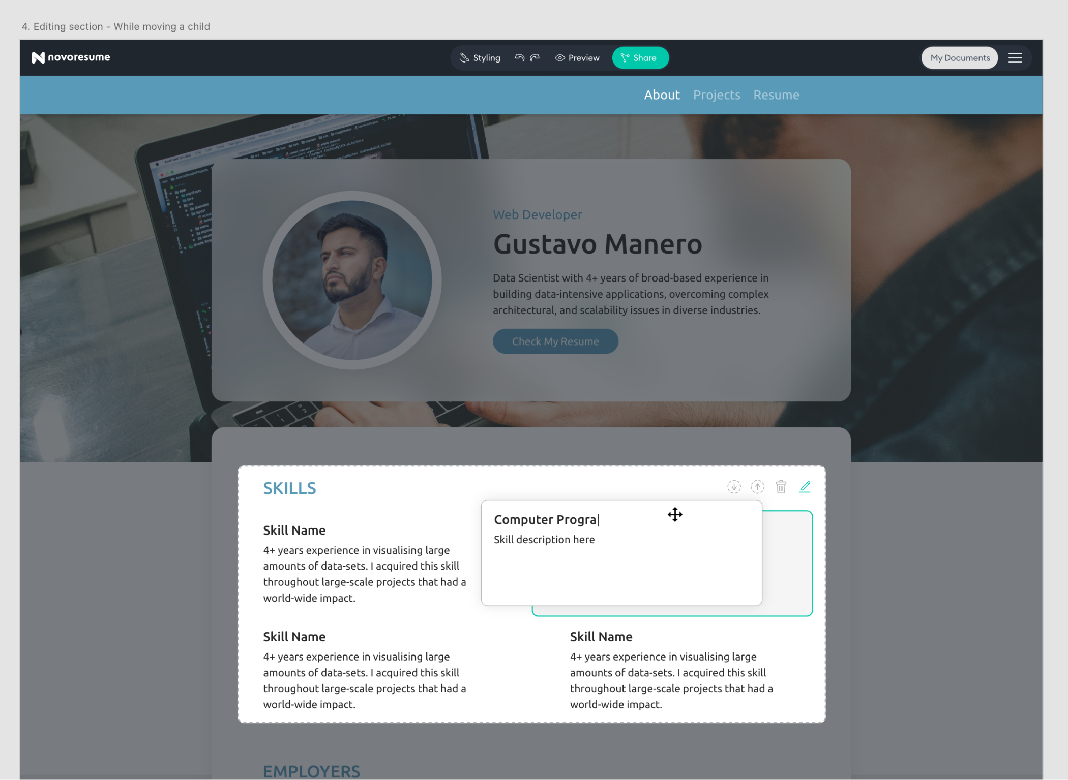 Next to the designs of the finished portfolio’s, we needed an interface through which users could edit and build their own portfolio. In order to save time, I used several existing components of our ‘Resume Editor’ but I also took the opportunity to explore some different ways of editing. The testing of the MVP could show that these new ways of editing are more useful and thus replicable to our other products in the company.
