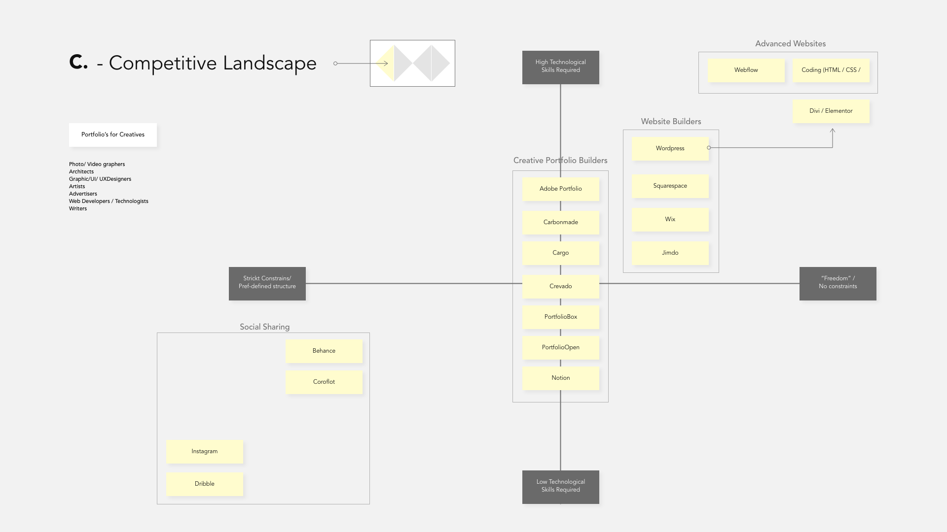 Following the mapping exercises, the next step was to analyze the competition. As there are many competitors in the field of portfolios and website builders, this exercise was focused on finding the different angles of the competition and explore what their main unique angles are. I did so by polarising the competition over two axes; level of technical skills required to make a website and level of pre-defined structure. This mapping resulted in the following overview.