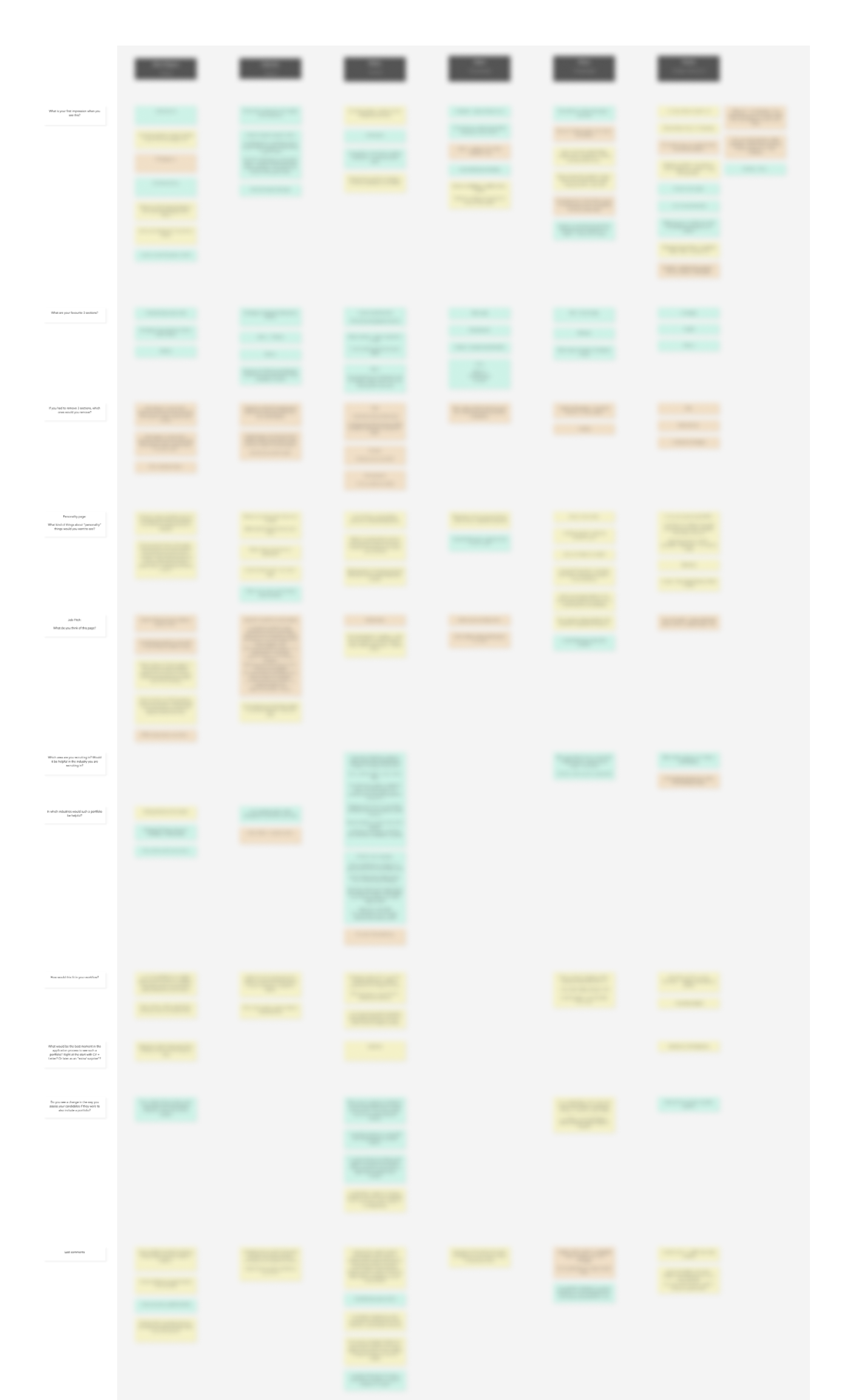 The last but crucial test before gathering all findings was to understand the recruiters’ / hiring managers’ perspectives. To do so, I interviewed 6 recruiters / hiring managers from different industries. These conversations helped to uncover their needs, which can be seen as even more important than uncovering the needs of job-seekers; it’s more important for an application to show exactly the things a recruiter wants to see instead of things he/she wants to show him/herself. The prototype was also shown to the recruiters to see their reaction and dig deeper into which sections job-seekers should include and which to skip